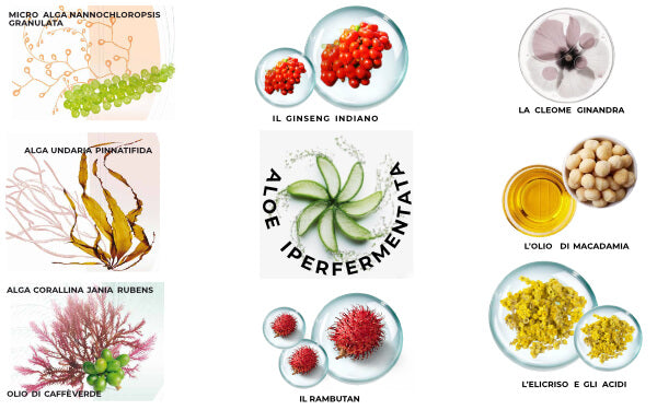Aloe Iper-Fermentata: Certificata bio, estratta tramite processi sostenibili di chimica verde. Azione idratante, anti-ossidante, protettiva. Ottenuta combinando per la prima volta una doppia fermentazione e la bioliquefazione enzimatica, per un ingrediente più attivo e sostenibile.
